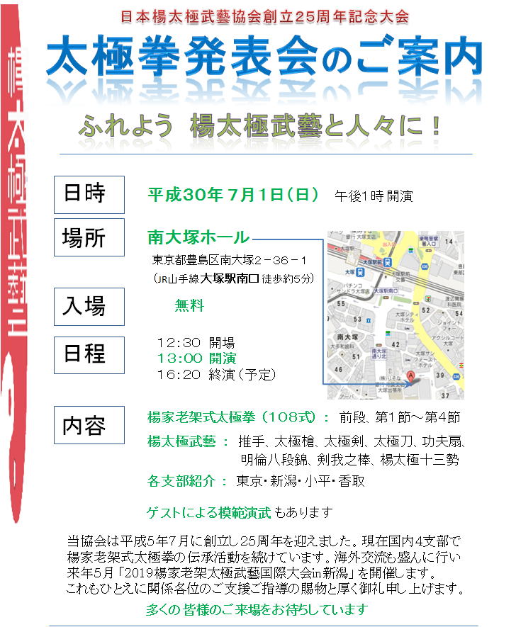 2018年7月 日本楊太極武藝協会の創立25周年記念大会を 東京にて開催しました。 ![]() ![]() |