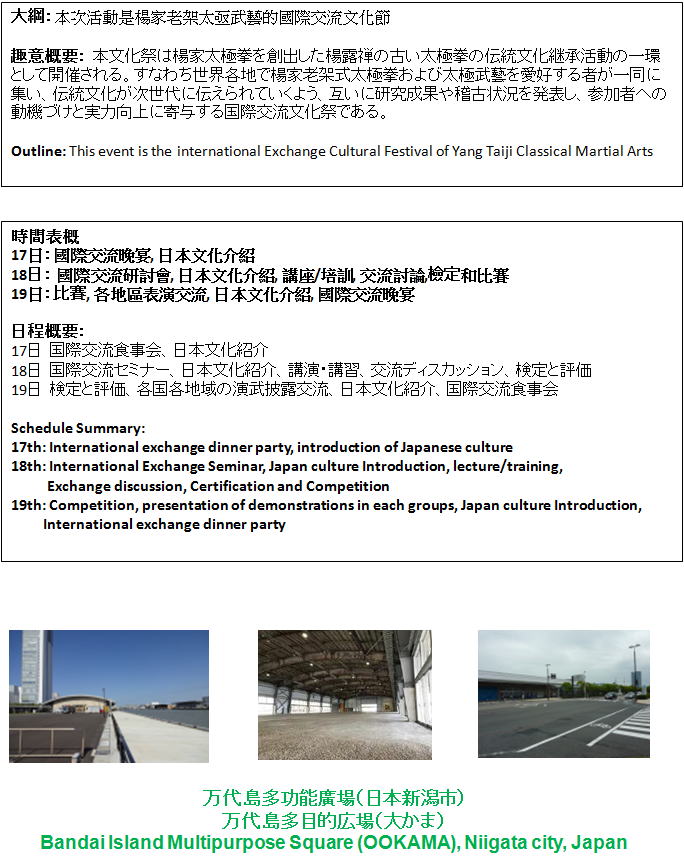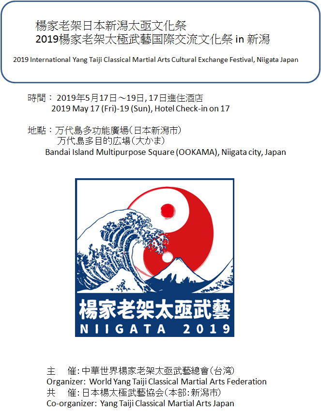 2019年5月 楊家老架太極武藝の国際交流文化祭を新潟市にて 台湾・ヨーロッパ・米国など200名以上の参加を得て開催しました。 ご協力ありがとうございました。 ![]()